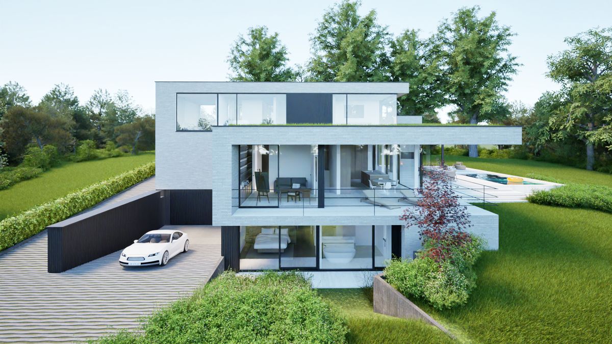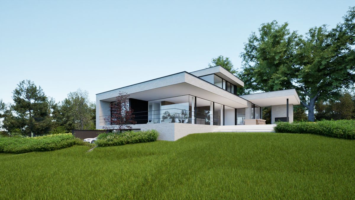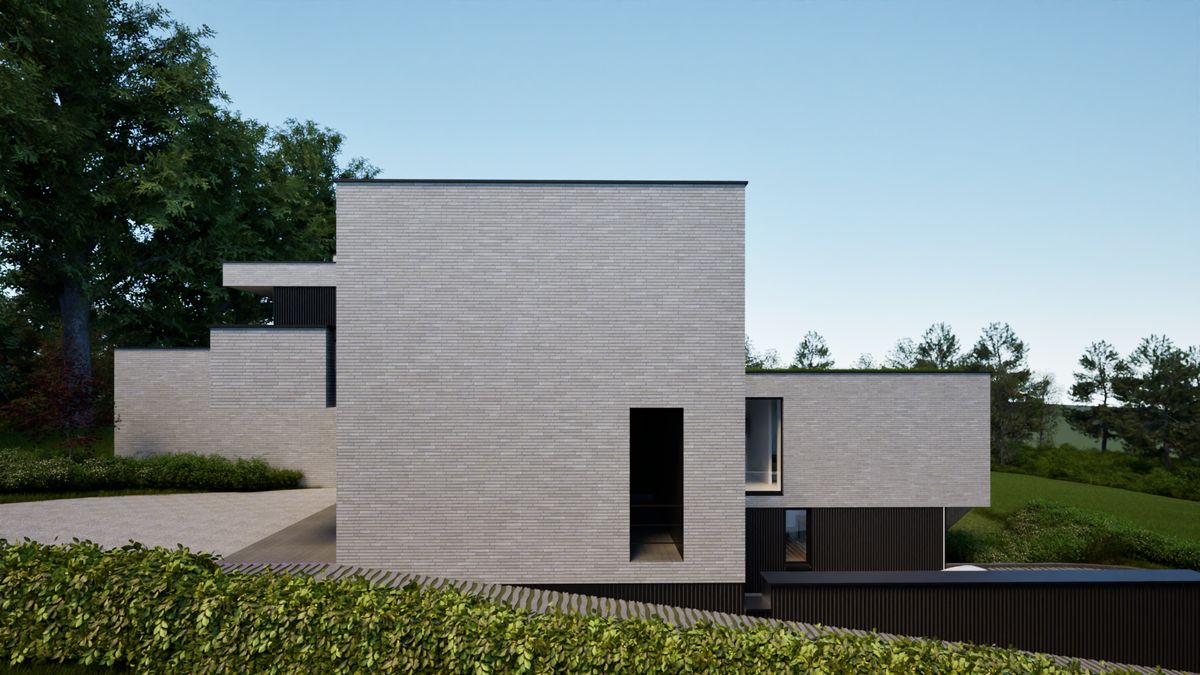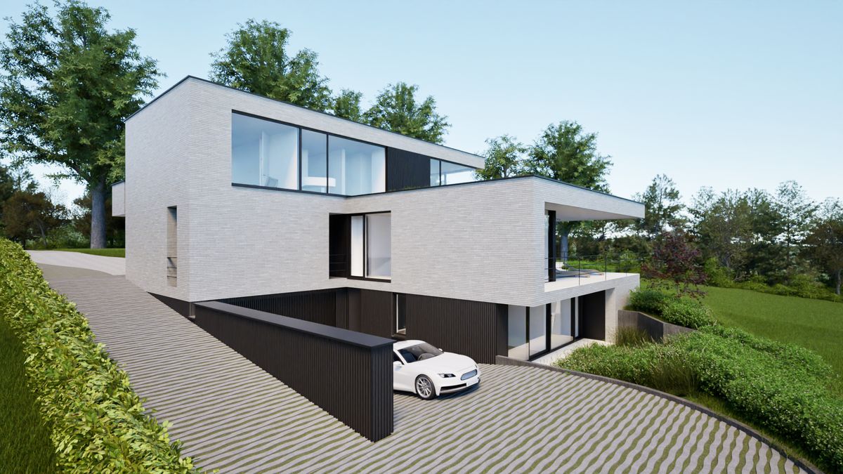 La façade avant, très dynamique en termes d’équilibre des volumes principaux et secondaires, se structure grâce à une arche élégante qui habille le carport. Celui-ci accueille un garage fermé et dessine une entrée couverte, éclairée devant la porte d’entrée d’une ouverture ronde dans le plafond. Étudié pour faciliter la vie quotidienne et la gestion des courses, l’imposant carport ouvre l’accès vers un garage qui mène directement à l’arrière-cuisine. Au nord, le pilier arrondi renforce encore la subtilité de l’articulation du bâtiment. L’angle ouest de la façade, vitré, permet de bénéficier d’un ensoleillement important, en particulier la lumière dorée de fin de journée. La pièce d’eau près de l’entrée appuie encore une esthétique tournée vers la nature de la villa