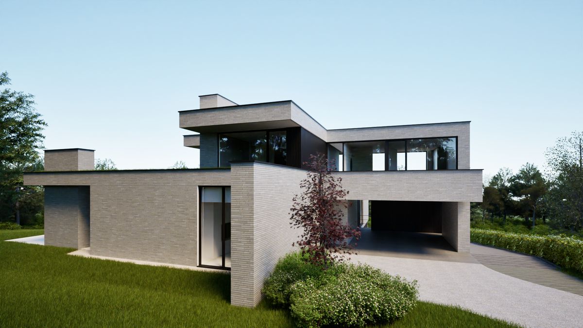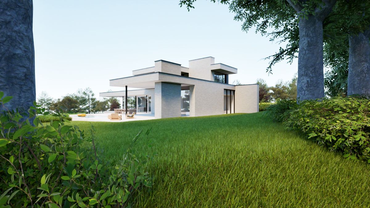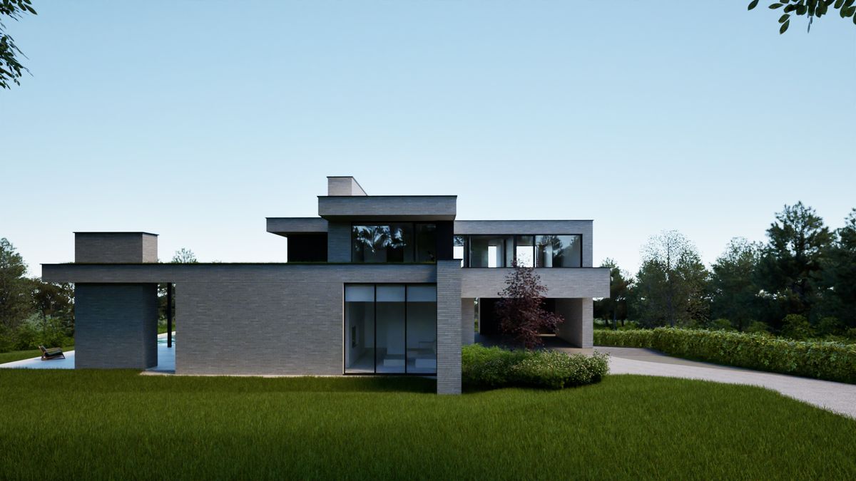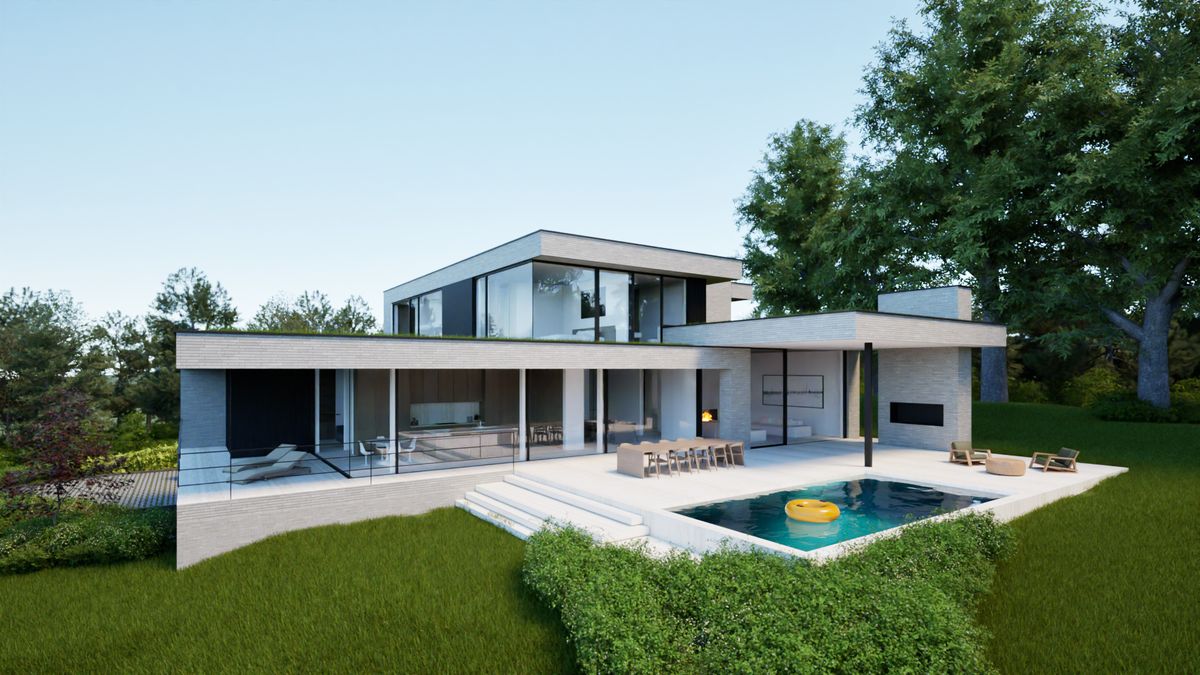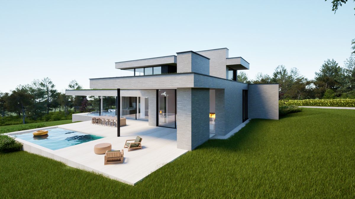 La façade avant, très dynamique en termes d’équilibre des volumes principaux et secondaires, se structure grâce à une arche élégante qui habille le carport. Celui-ci accueille un garage fermé et dessine une entrée couverte, éclairée devant la porte d’entrée d’une ouverture ronde dans le plafond. Étudié pour faciliter la vie quotidienne et la gestion des courses, l’imposant carport ouvre l’accès vers un garage qui mène directement à l’arrière-cuisine. Au nord, le pilier arrondi renforce encore la subtilité de l’articulation du bâtiment. L’angle ouest de la façade, vitré, permet de bénéficier d’un ensoleillement important, en particulier la lumière dorée de fin de journée. La pièce d’eau près de l’entrée appuie encore une esthétique tournée vers la nature de la villa