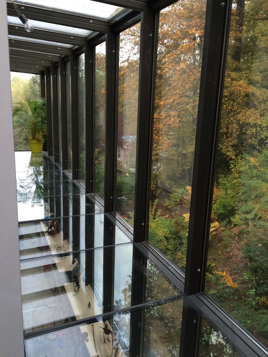 Le verre est toutefois le grand atout de cette extension sur terrain boisé. Et l‘élément qui lui confère son originalité. Afin de profiter pleinement des bois qui s’étendent à l’arrière du terrain, il fallait ouvrir au maximum la façade arrière sur tous les étages. Une structure métallique entièrement vitrée s’étend donc du rez-de chaussée jusqu’au premier étage. Cette peau en verre est mise en œuvre pour former non seulement la façade proprement dite mais aussi tous les éléments attenants : toiture, planchers et plafonds.